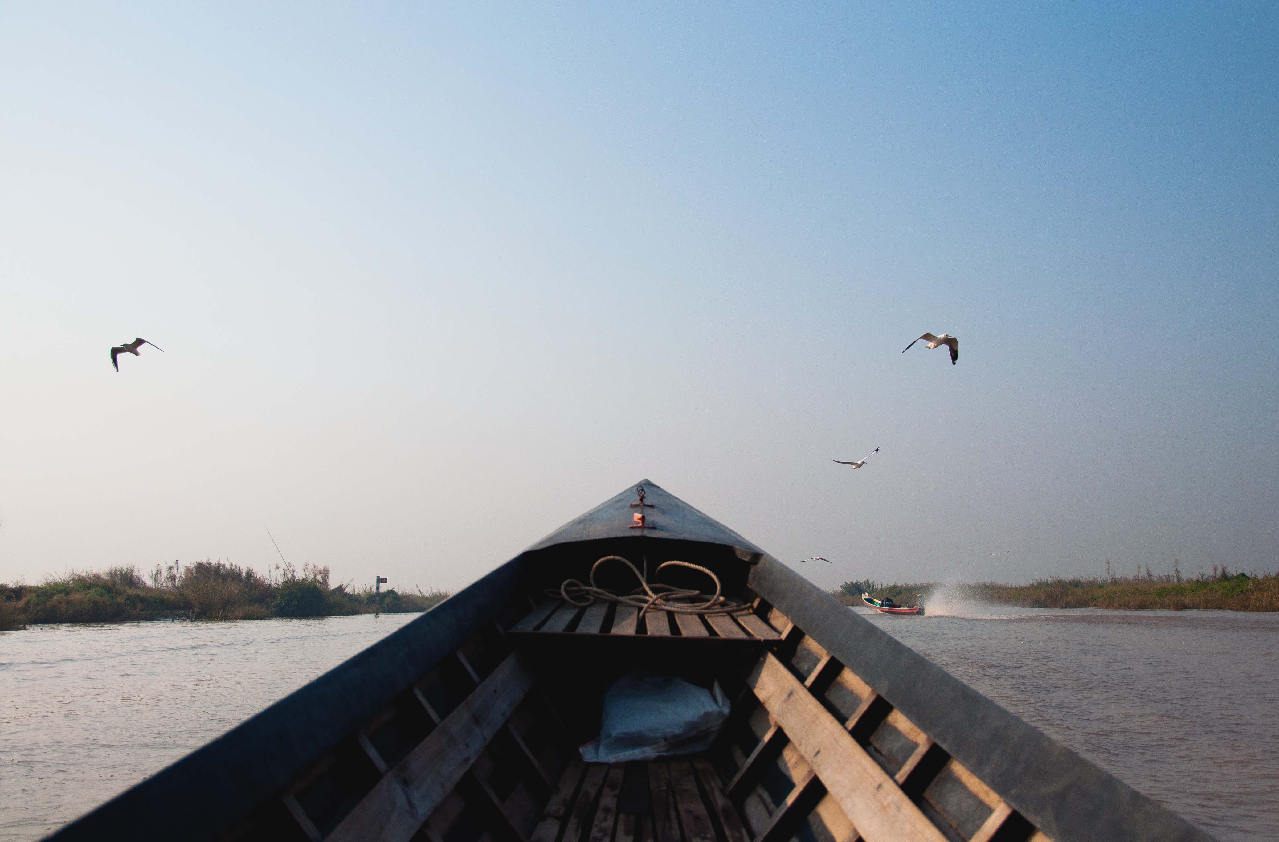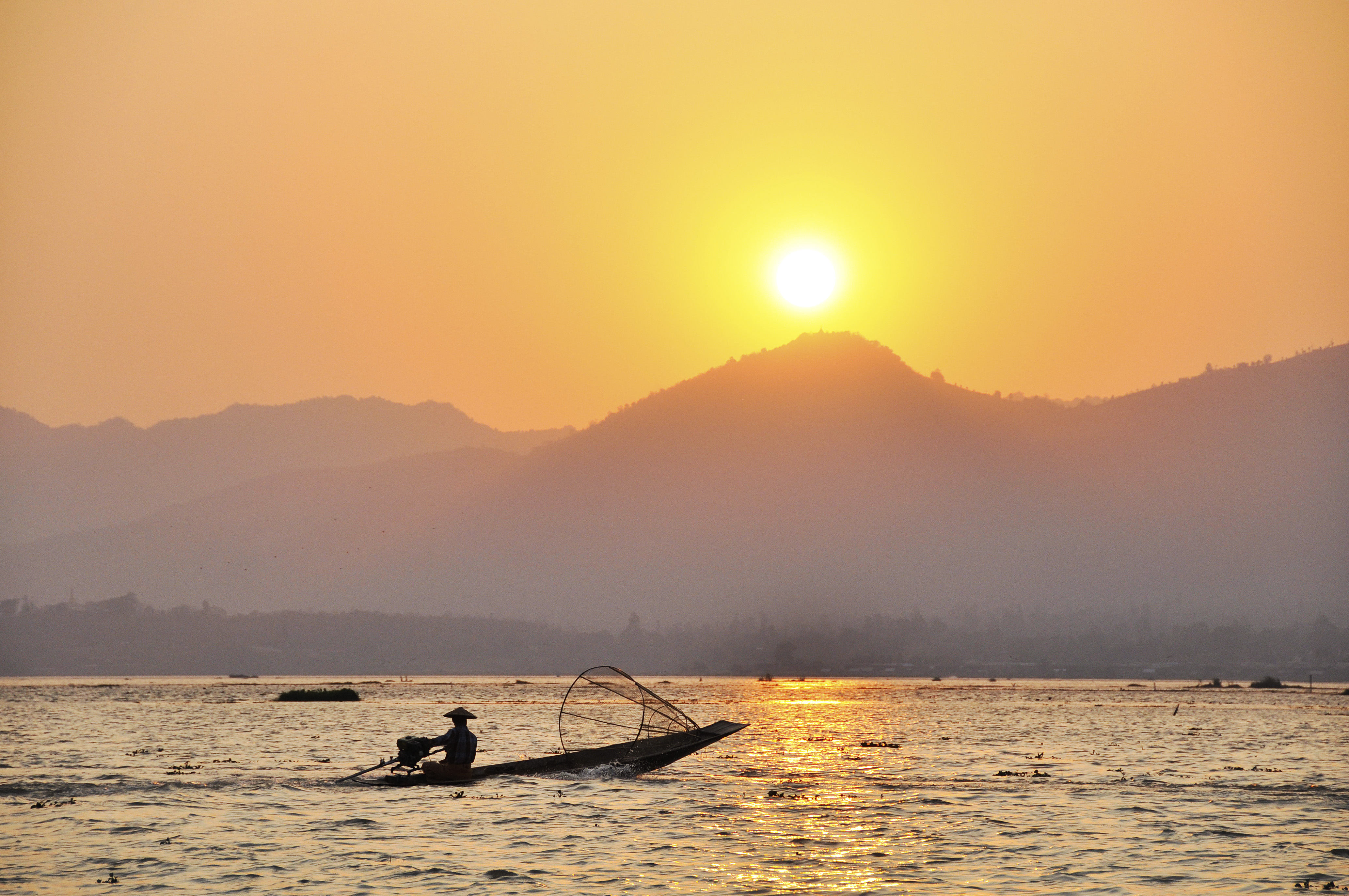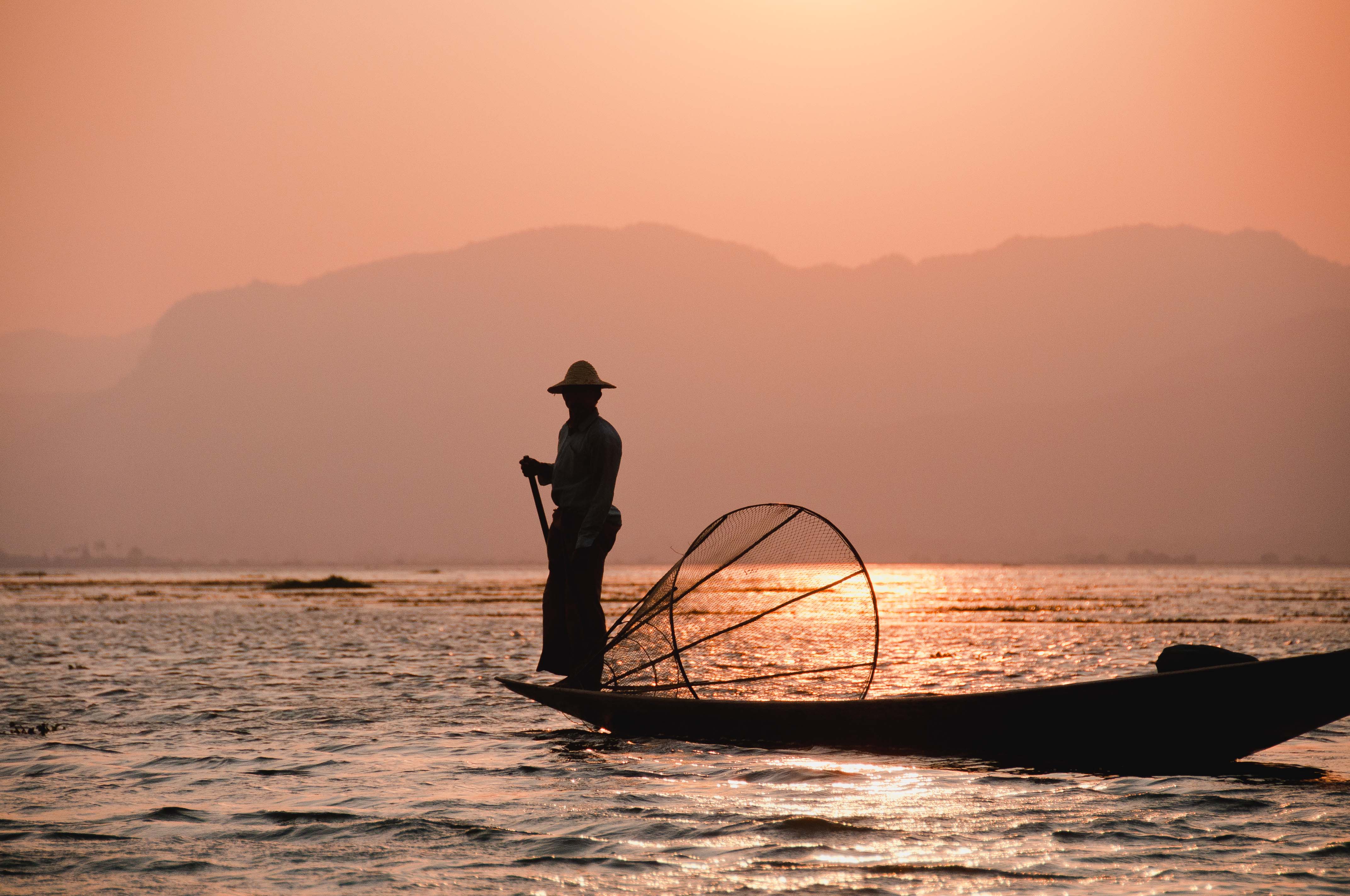 Seeing the confused expression on my face, he raises a hand, brown from years spent as a guide and boatman in Inle Lake, and points towards the west. The sun, an orange disc so perfect you could pluck it from the sky and hold it in the palm of your hand, is sinking slowly behind a range of periwinkle mountains, the sky fiery and vibrant with luminescent hues of orange and pink. A few fishing boats pass by with men in straw hats holding cone-shaped nets perched precariously at one end, one foot gripping and working a paddle.