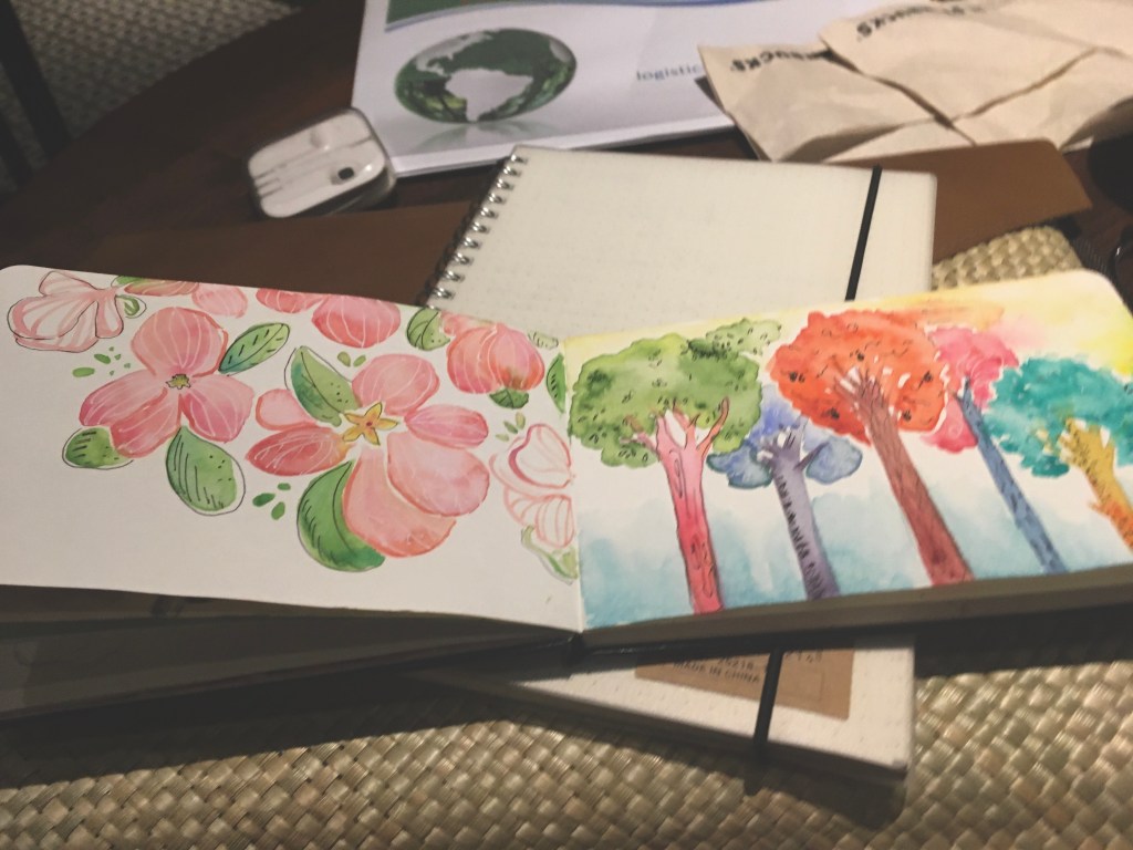 The rain poured like the tears of a child ordered to stop playing with his games, a light wind summoned to add some pomp and impudence. Later, it rained like lovers breaking up and I could feel the cold and gloom seeping into my bones. Even the hot coffee and snacks could not help lift my mood. I tried to paint away the grays and blues, but the colorful trees on the page just seemed sad in the dim light of the cafe. I booked a ride home and ended up paying a hefty fare. I just wanted to get outta there quick.