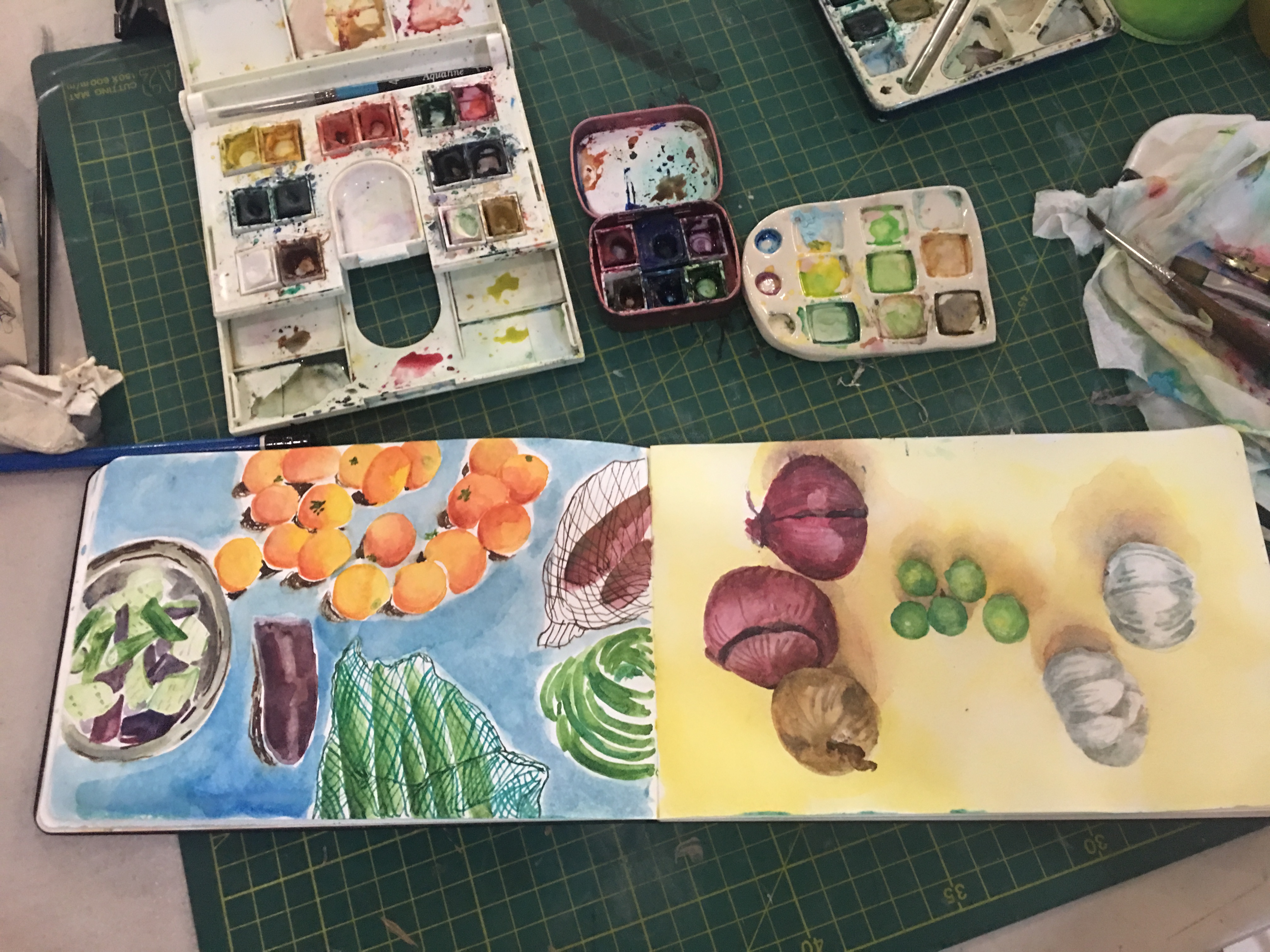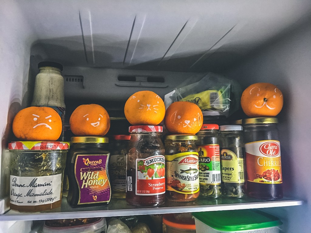 The topmost shelf is reserved for bottled food and resting on the tin caps are mandarins with silly faces drawn in white ink. Framed against the sloping roof of the ref, they look like totem poles, bodies made of glass with jam, capers, or dried fish soaked in oil pressed against the surfaces.